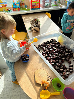 Herfst in het bos: kastanjes, blaadjes van de bomen, nootjes, een eekhoorn, een egel, paddenstoelen en kabouters,...